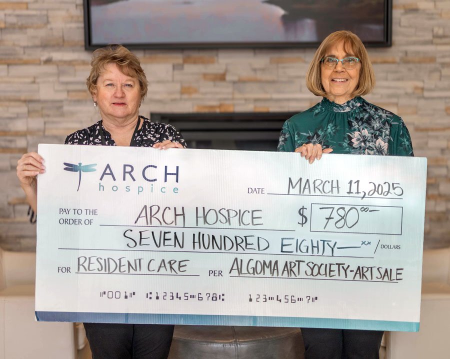 Algoma Art Society member Valerie Hurdle and lady from ARCH proudly display cheque of $780.00 donated to ARCH from the proceeds of the sale of 6x6 paintings at the Sault Ste. Marie Museum. Members of Algoma Art Society were the artists who provided the 6x6 paintings.