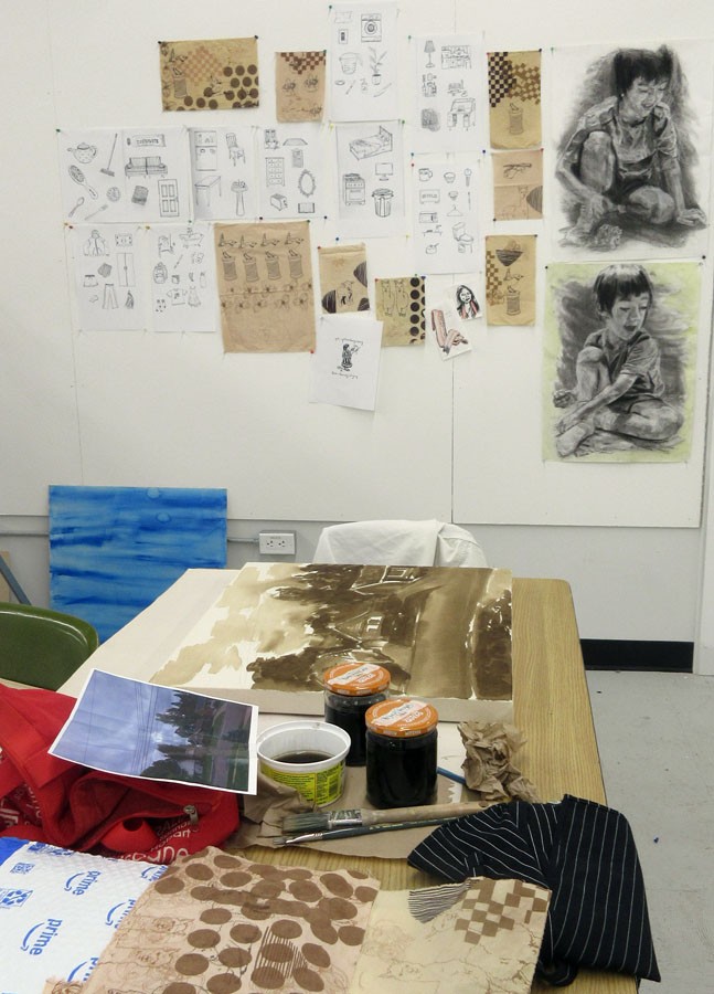 AAS members working on oil monoprints - Lil - Marcella and Wendy.