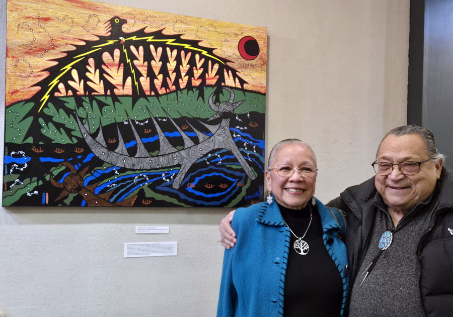 Judy Henderson and Doug Iles met with Lucia Laford at the Art Gallery of Algoma where she spoke about her Woodland painting style and talked about her paintings which were in a display along with those of her recently deceased father and mentor, John Laford.
